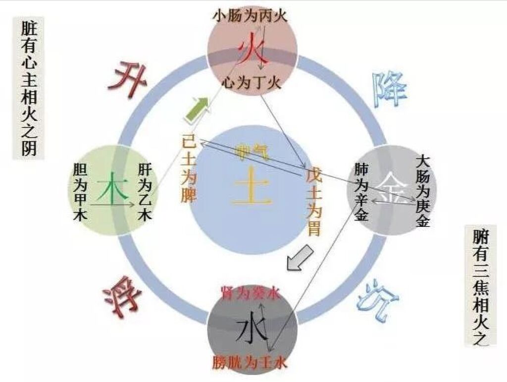 The pre-heaven qì—yuánqì—drives the qi of the spleen and stomach to rotate. Through the spinning mediation of rising and descending of spleen qi and stomach qì, the qi of the liver, heart, lung, and kidney is propelled to rise on the left and descend on the right, forming a complete, ring-like circulation without beginning or end